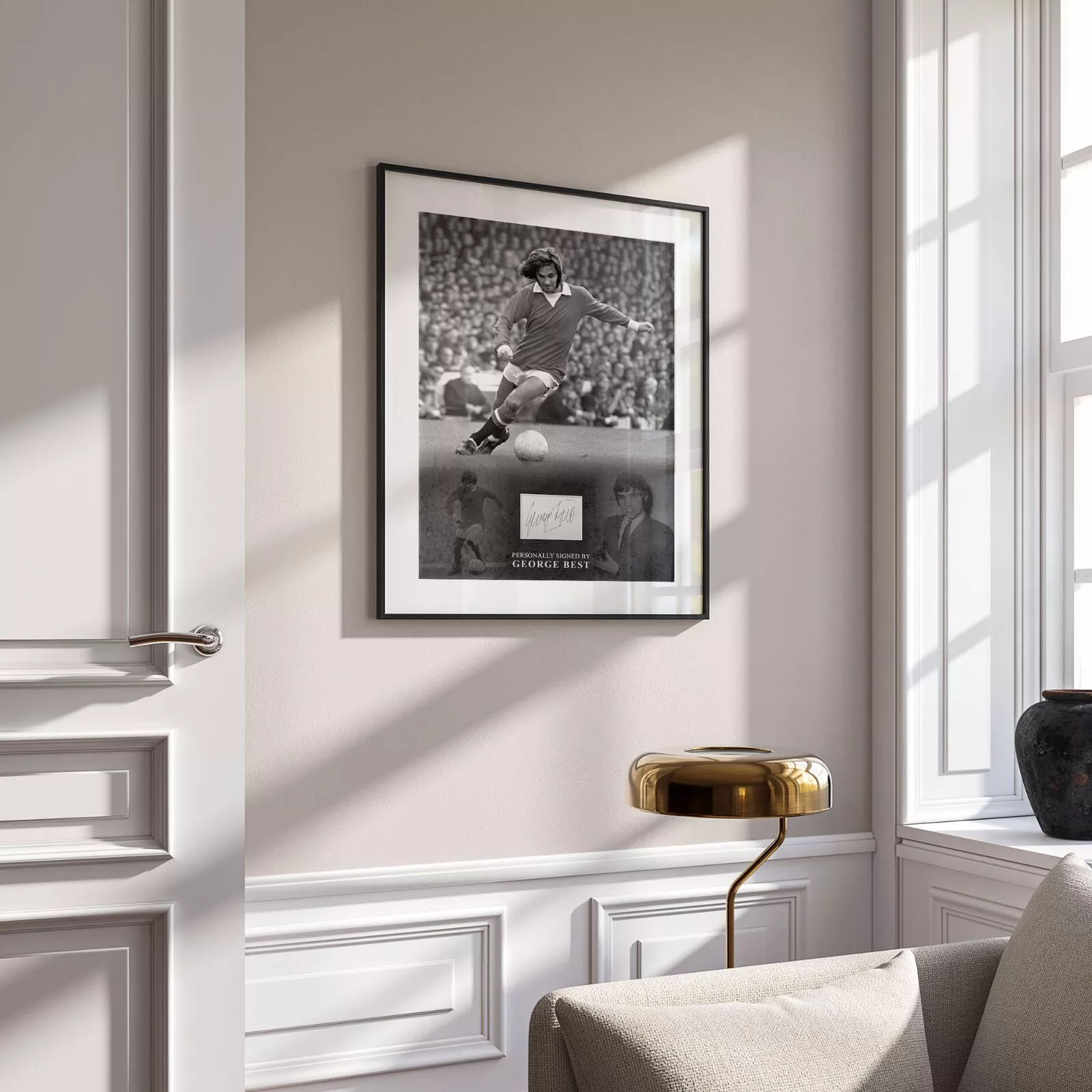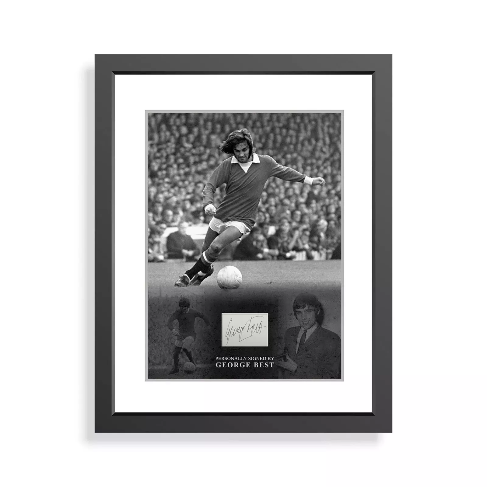 It shows George in action for Manchester United and has been mounted & framed to an overall size of 20x16 inches. This item is framed using a handmade wooden frame with a smooth matt finish. All items are framed using Perspex to minimise damage in transit and come complete with hanging kits.